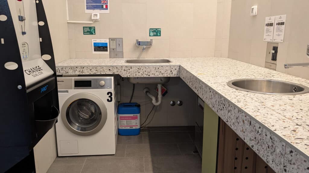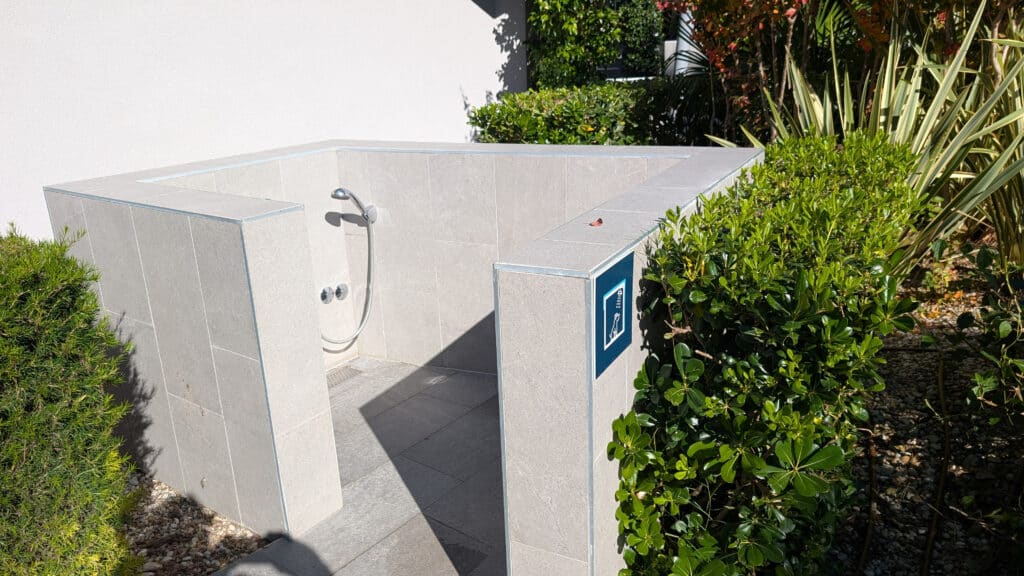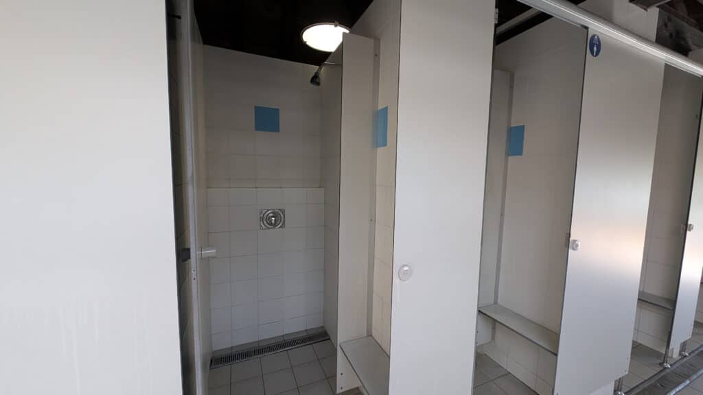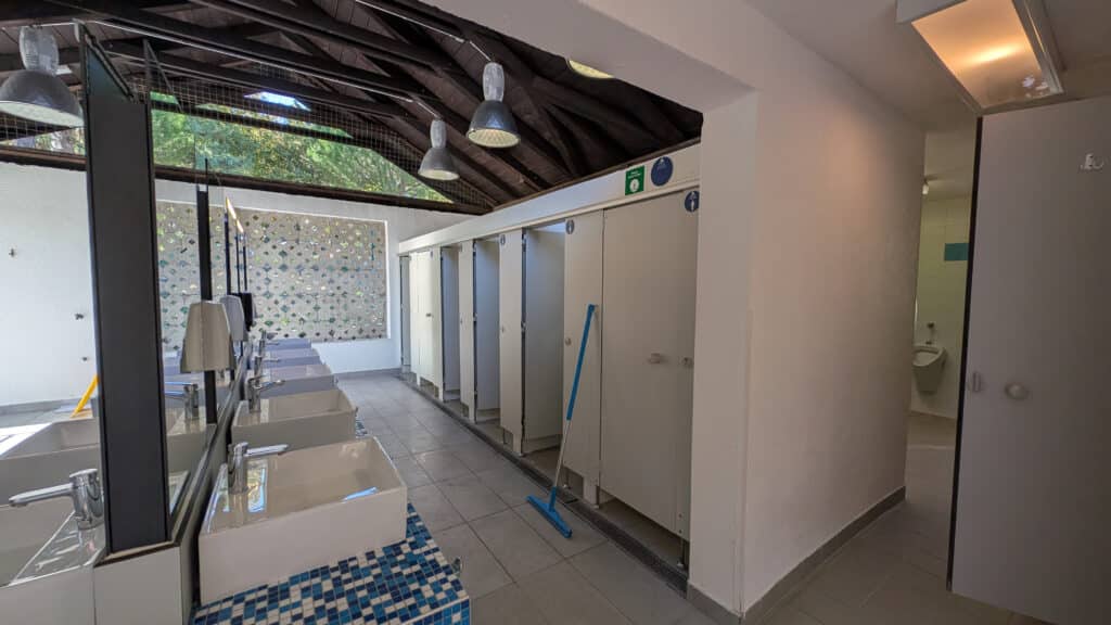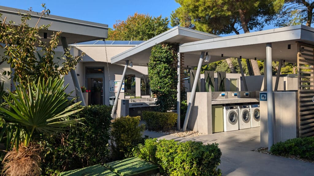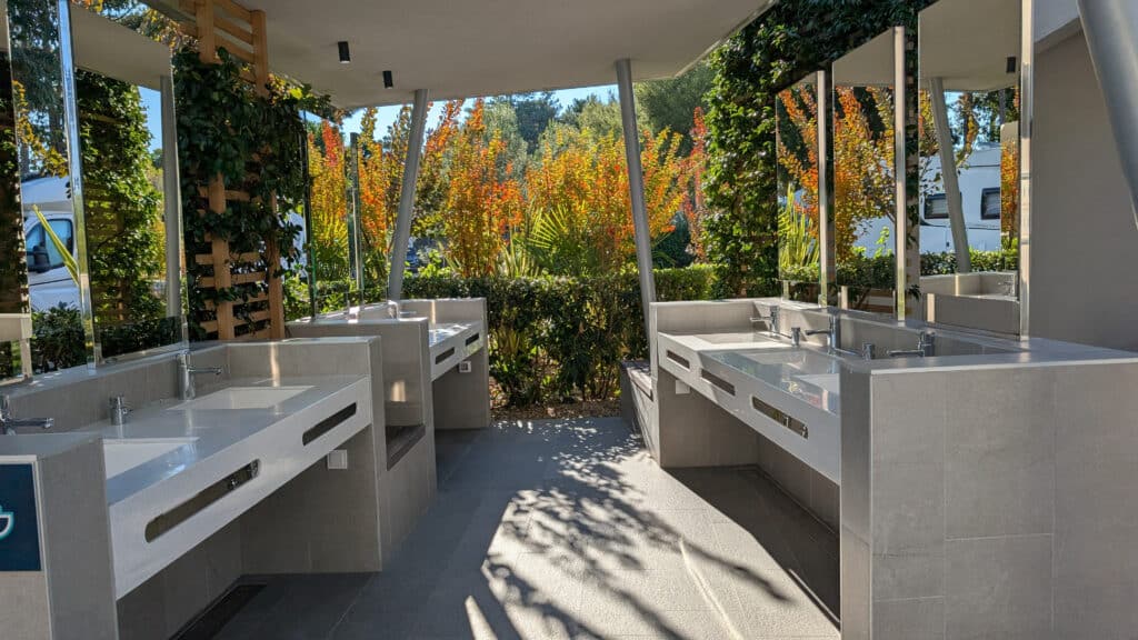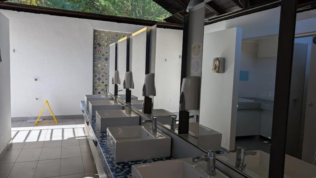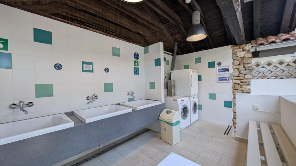 Das moderne Waschhaus ist toll ausgestattet, für den Sommer sind viele Einrichtungen auch im Außenbereich vorhanden. Waschbecken, Duschen, Geschirr- und Wäschebecken sind allesamt draußen – es gibt aber auch Duschen im inneren des Gebäudes. Die WCs sind freilich allesamt indoor.