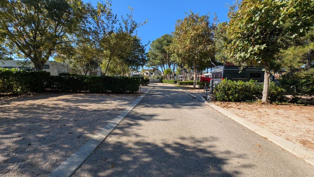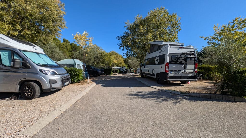 Die Stellplatze sind unterschiedlich groß, von riesigen Parzellen, sehr langen engen Plätzen bis eher Kleinen ist vieles zu finden. Der Untergrund ist größtenteils eben und geschottert, Bäume und Hecken spenden im Sommer schatten. Strom ist auf allen Plätzen sehr nahe zu finden, auch Wasser gibt’s jeweils zwischen den Parzellen.