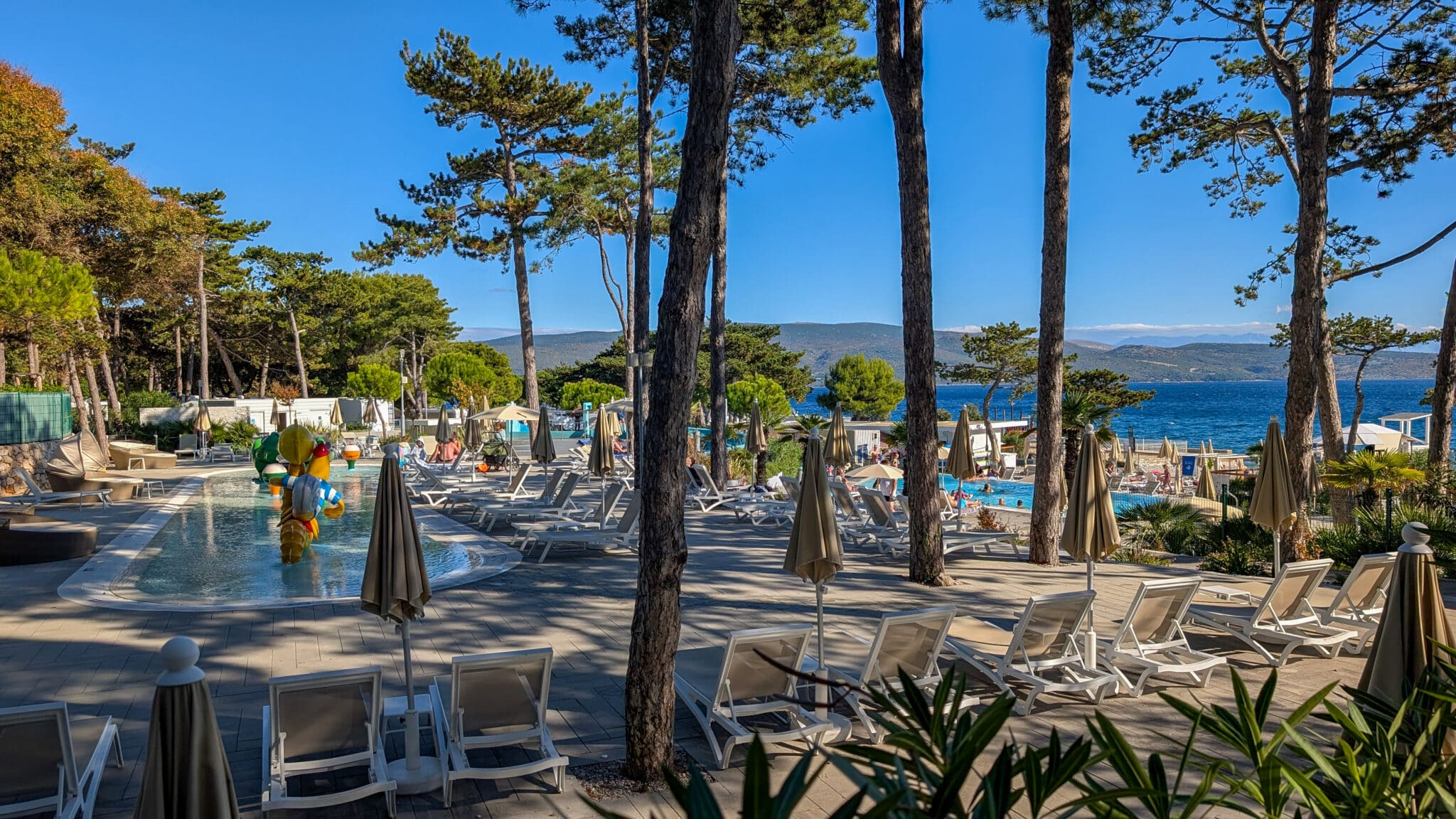 Es gibt einige Buchten mit feinem Kies, für die Größe des Campingplatzes fanden wir die Buchten aber etwas klein. Auch ein Poolbereich mit einem Kinderbereich und Schwimmbecken ist am Platz vorhanden.
