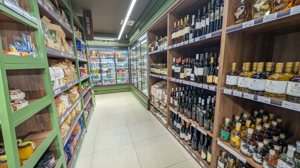 Am Campingplatz gibt es ein Restaurant und zwei Bäckerstände sowie einen kleinen Shop. In der Hauptsaison sind auch viele kleine Stände im Animationsbereich zu finden. Außerhalb findet man direkt verschiedene Restaurants, im Oktober waren diese jewoch geschlossen. Fußläufig – in etwa 10 Minuten erreichbar – ist die Innenstadt von Krk zu erreichen. Hier gibt es jede Menge Restaurants, Bars, Bäckereien aber auch lokales Geschäfte und eine Apotheke.