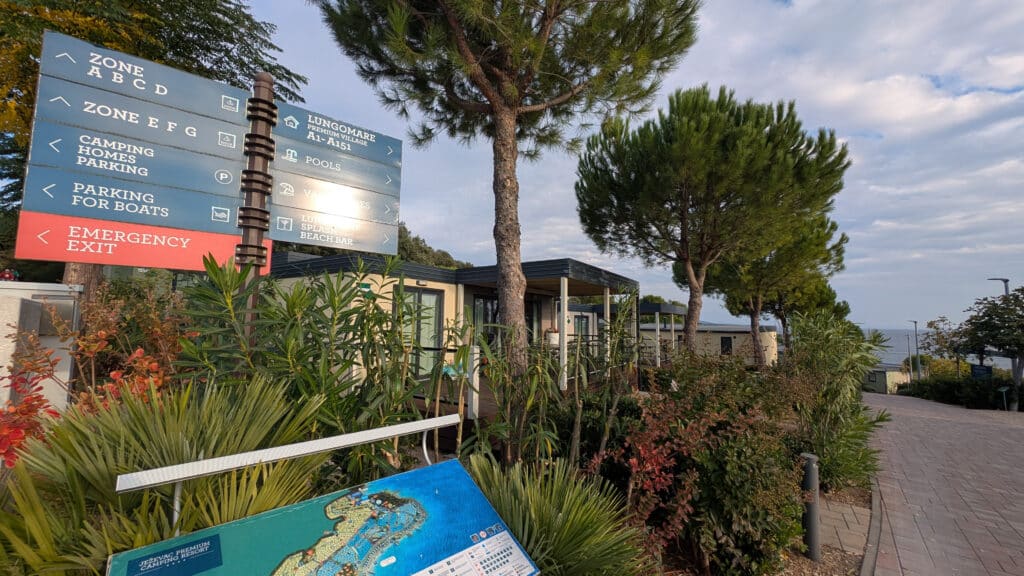 Am Campingplatz angekommen stellen wir den Bus direkt vor dem Schranken in einer der beiden Check-in Spuren ab. Hier kann man erahnen, was sich in der Hauptsaison abspielt. Wir kommen direkt dran und können und anhand einiger Fragen eine Parzelle am Plan aussuchen. Die Rezeptionistin will uns Fotos von der Parzelle zeigen, aber genau für unsere ist keines vorhanden. Wir sollen nun zu fuß über den weitläufigen Platz spazieren, die Parzelle begutachten bzw. Alternativen aussuchen. Gesagt – getan: Wir entscheiden uns für einen sonnigeren Platz, nach etwas 15 Minuten sind wir zurück an der Rezeption, zeigen noch unsere ACSI-Karte, senden einen Screenshot als Bestätigung an die gewünschte E-Mail Adresse, bezahlen den gesamten Aufenthalt und dürfen schlussendlich die Parzelle beziehen.