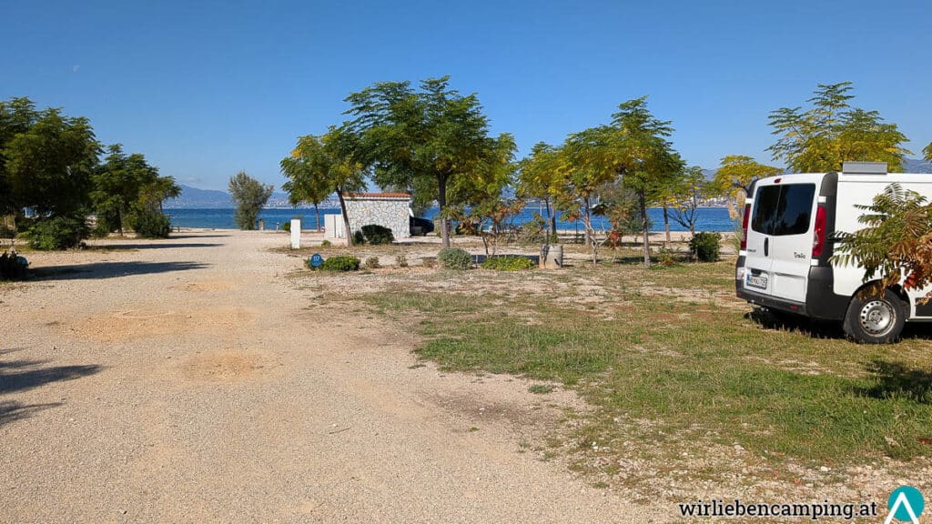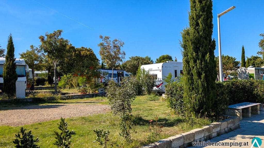 Der Fünfsterne Campingplatz ist großzügig angelegt und liegt direkt am Meer. Die Parzellen sind in Terrassen angelegt und haben allesamt Schotter als Untergrund. Viele Olivenbäume, Lorbeerhecken und Rosmarinsträucher säumen die Parzellen – einige größere Bäume sorgen für Halbschatten. Jede Parzelle ist mit einem eigenen Stromkasten, Frischwasser sowie einem Kanalanschluss ausgestattet.