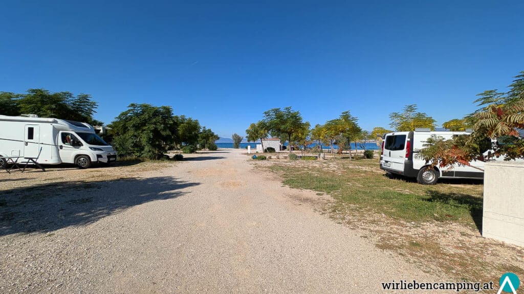 Der Campingplatz liegt an der Bucht Pušća und schlängelt sich entlang des langen, feinen Kiesstrands, welche flach abfällt. Gegenüber sieht man die LNG-Türme des unweitgelegenen LNG-Hafens. Der Campingplatz hat auch einen kleinen Pool nahe des Restaurant. Einige Mobilhomes verfügen über private Pools.