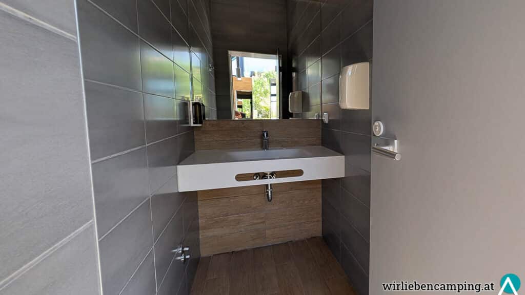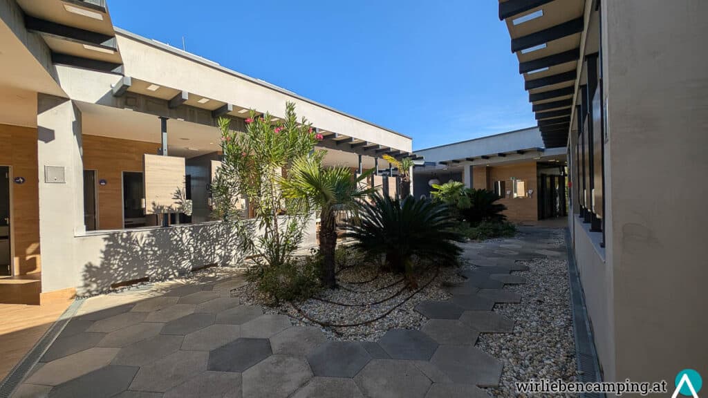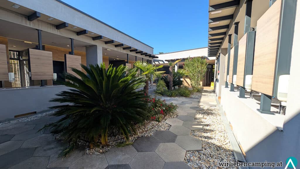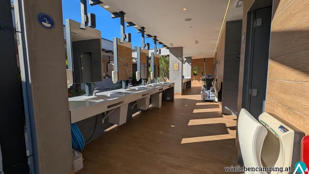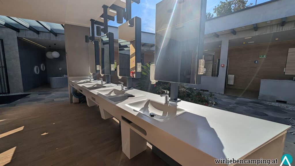 Die Sanitäranlagen sind modern, sauber und in gutem Zustand. Vieles spielt sich im Freien ab, das Gros der Waschbecken befindet sich im Innenhof des Sanitärgebäudes. Duschen, Einzelwaschbecken und Toiletten sind natürlich auch in Kabinen zu finden.