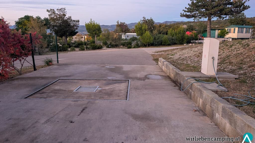 Das Cahemie-Klo kann man hinter dem Gebäude entleeren, ein perfekt ausgestatteter Raum mit Wasserschlach, Entsorgungstoilette, Handwaschbecken und Papier steh hierfür bereit. Auch für den Grauwassertank gibt es einen Bodenkanal, hier gäbe es auch einen Reinigungsautomaten für die Toilettenkassetten.