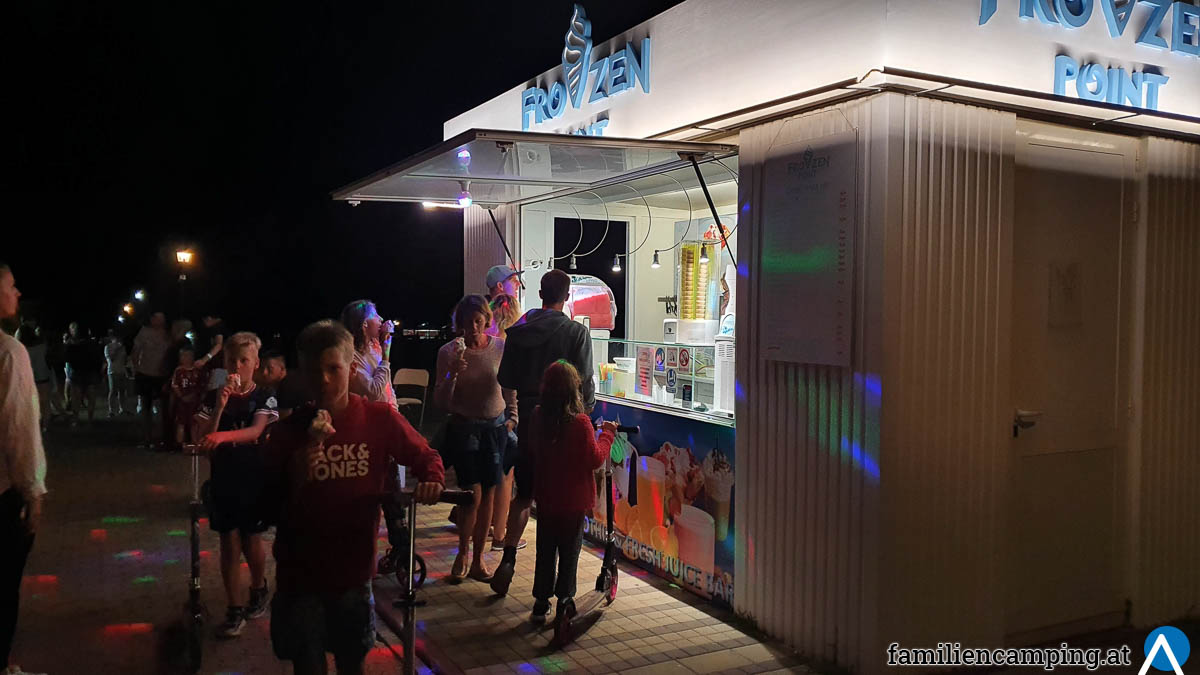 Am Abend sperren in der „Hauptstraße“ des Campingplatzes, die von der Rezeption bis ans Meer führt, Standln auf, die Eis, Crêpes, Zuckerwatte und ähnliches verkaufen, auf und man kann sich Tattoos aufsprühen lassen.