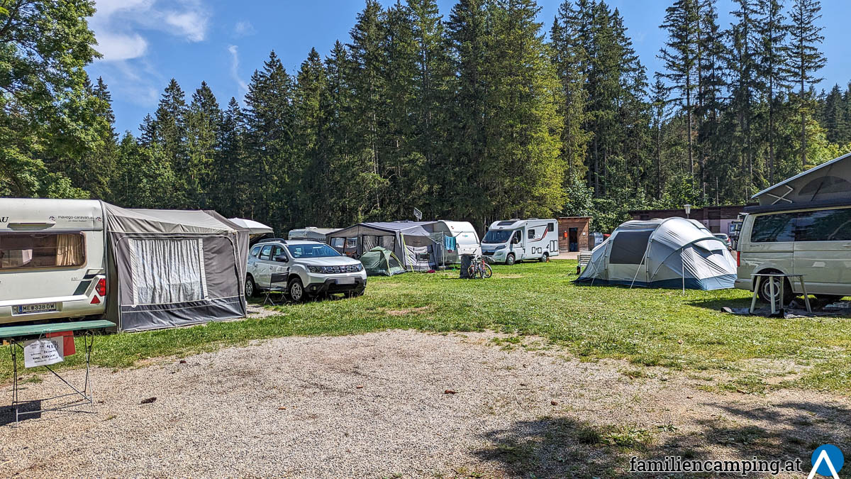 Der Campingplatz ist nicht parzelliert. Jeder steht, wie es geht und wo Platz ist. Wenn der Campingplatz weniger stark ausgelastet ist, ist die Chance größer, ein schönes Fleckerl zu bekommen. Bei unserem Besuch waren die Plätze recht unterschiedliche aufgeteilt. Ein Wohnwagen mit Vorzelt und großem Auto neben einem kleinen Van mit zwei Campingstühlen davor oder ein Familienzelt, jeder nahm so viel Platz, wie er benötigte. Wenn man Pech hat, stellt sich ein weiterer Campinggast dicht dazwischen.