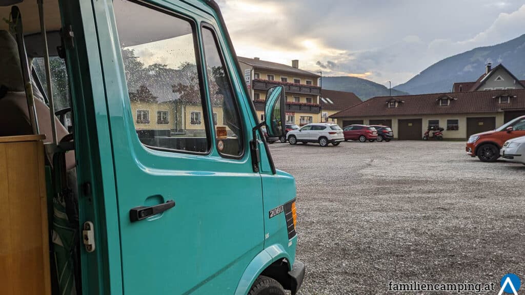 Den ganzen Tag genießen wir mit zahlreichen Aufgüssen. Geplant war, den großzügigen Parkplatz zum Nächtigen zu nutzen. Da dieser jedoch sehr schief ist und wir Nachbarn im Bulli haben, welche offensichtlich gerne Musik hören, beschließen wir, die App zu öffnen und kontaktieren spontan ein nahegelegenes Gasthaus (#1104), welches uns sehr gerne am Parkplatz campen lässt. Herzlich empfängt uns der Wirt. Die Wirtsleute sind selbst passionierte Camper, bieten uns gerne auch Strom und die Toilette während der Öffnungszeiten an. Wir freuen uns nun auf ein köstliches Wiener Schnitzel mit Pommes. Das Angebot, das Geschirr des Gasthauses zu verwenden, um nicht abwaschen zu müssen, nehmen wir sehr gerne an. Satt und entspannt schlafen wir und treten die Weiterreise Richtung Wien an.