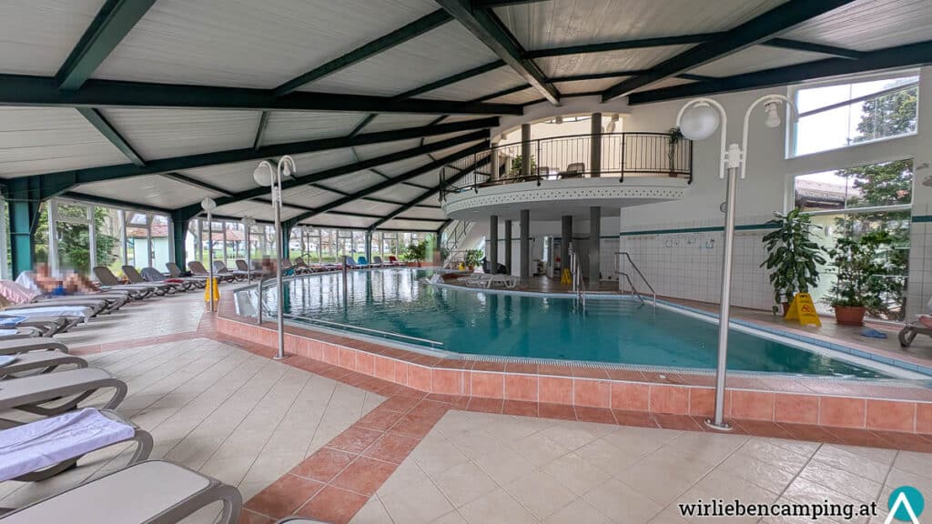 Direkt am Campingplatz gibt es zwei keine Thermalbecken. Diese haben für Campinggäste bereits ab 6:00 Uhr geöffnet, sperren aber leider schon um 18:00 Uhr zu. Das Becken mit dem stärksten Wasser wird täglich abgelassen, geputzt und über Nacht frisch eingelassen und hat etwa 36 – 38 Grad. Fast der gesamte Rand bietet Sitzmöglichkeiten, ein Großteil davon ist auch überdacht. Ein zweites Becken mit schwächerem Wasser hat etwa 34 – 36 Grad Celsius, hier gibt es aber keine Überdachung. Innen steht ein halbmondförmiges Becken mit ~32 Grad zur Verfügung, hier gibt es auch Liegen, welche an kalt-nassen Tagen aber bald alle belegt sind. Das Wasser verfügt über einen hohen Mineralgehalt und riecht schwefelig, wir empfanden das Baden sehr angenehm und entspannend. Im Sommer gibt es im Außenbereich außerdem ein Sportbecken zum Schwimmen sowie ein Kinderbecken.