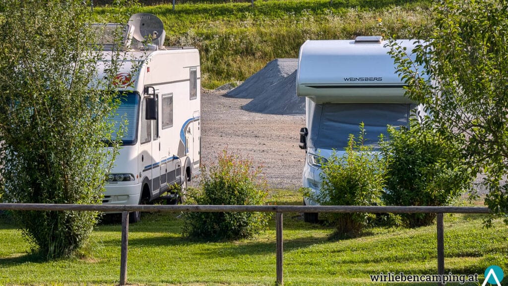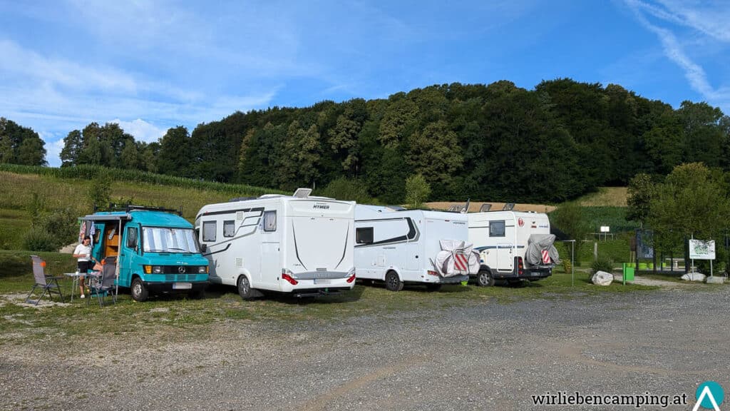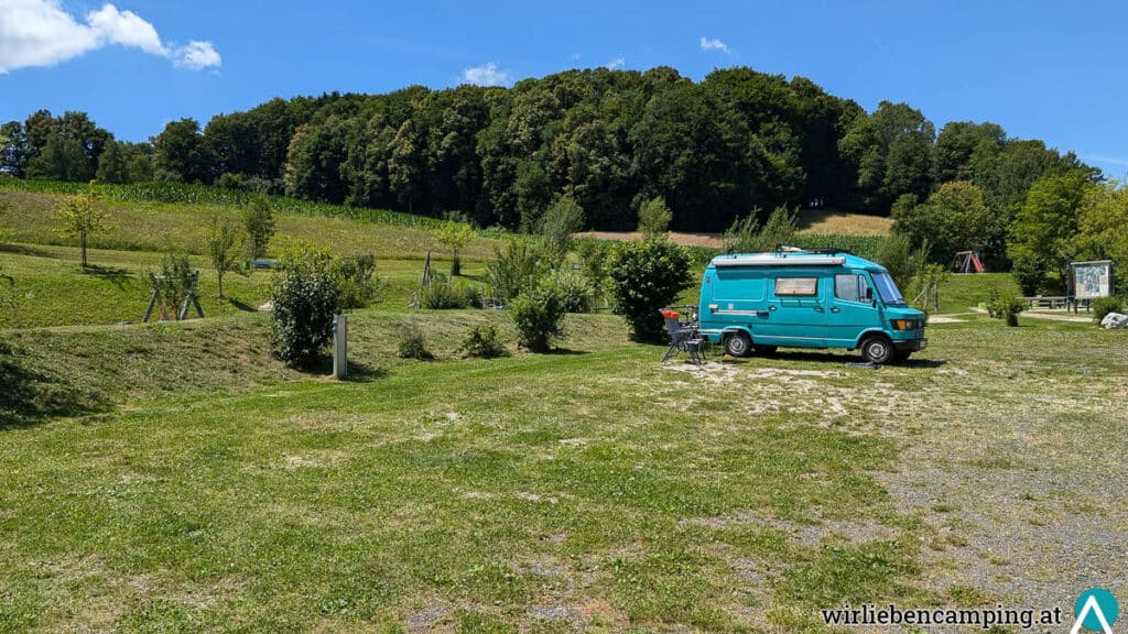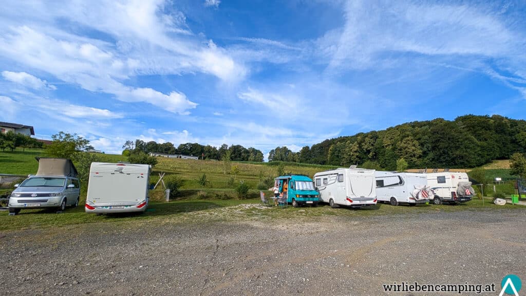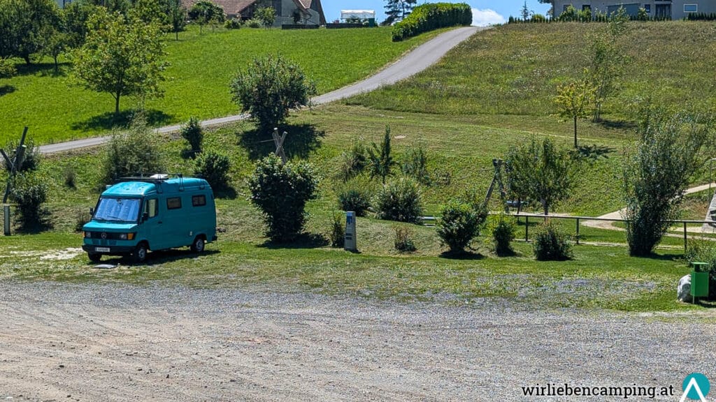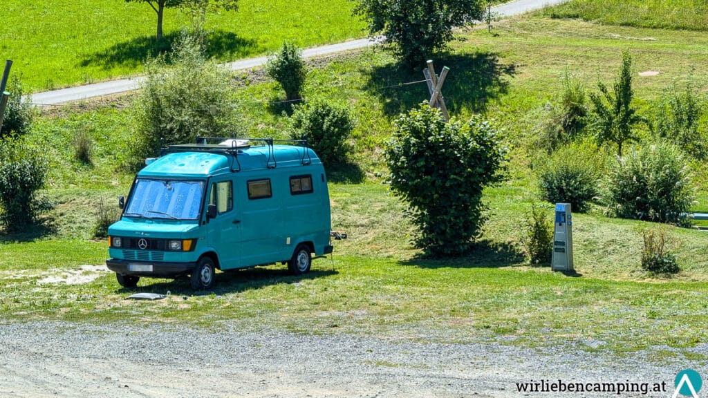 Wir erreichen den Platz am frühen Freitagnachmittag und haben freie Platzwahl. Es ist (noch) niemand hier, also stellen wir unseren Van auf einem geraden Platzerl in der Nähe einer Stromsäule ab – wir sind zwar autark, aber man weiß ja nie, vielleicht spielt die Sonne ja mal nicht mit…